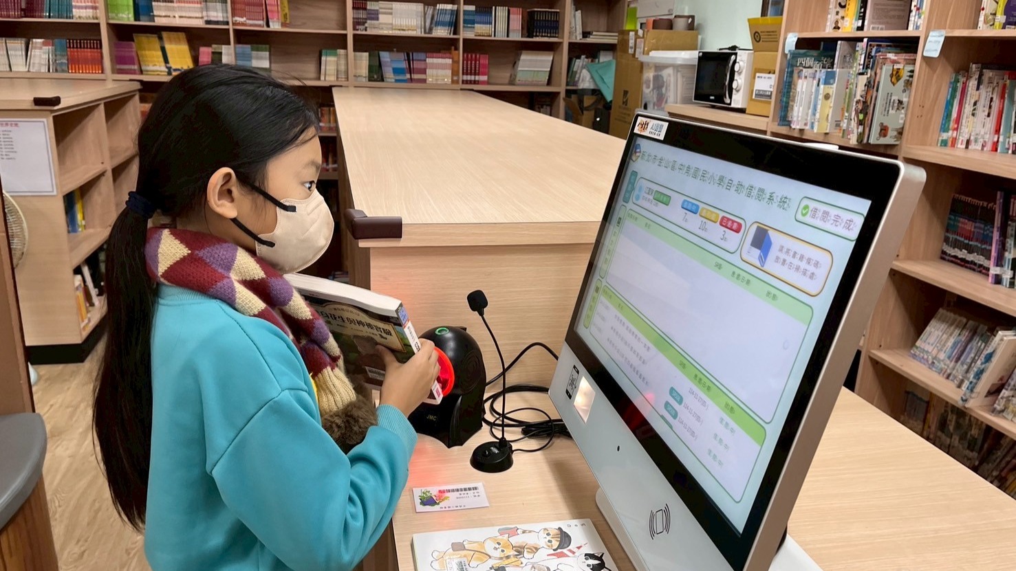 下課時,孩子們都會主動來到圖書館,進行自助借還書的動作。