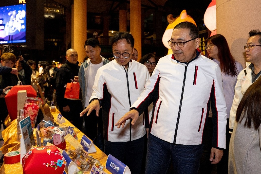 侯友宜市長、代言人陳彥博與觀旅局長於1月30日記者會平溪商圈攤位上參觀在地特色文創商品