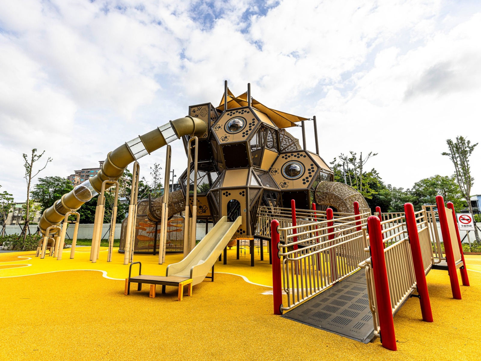 新工處推動「快樂公園第3期闢建工程」,融合全齡友善與共融式設計,設置蜂巢主題遊戲塔、健身設施及遊具,提供優質休憩空間,獲得第25屆公共工程金質獎土木類優等。