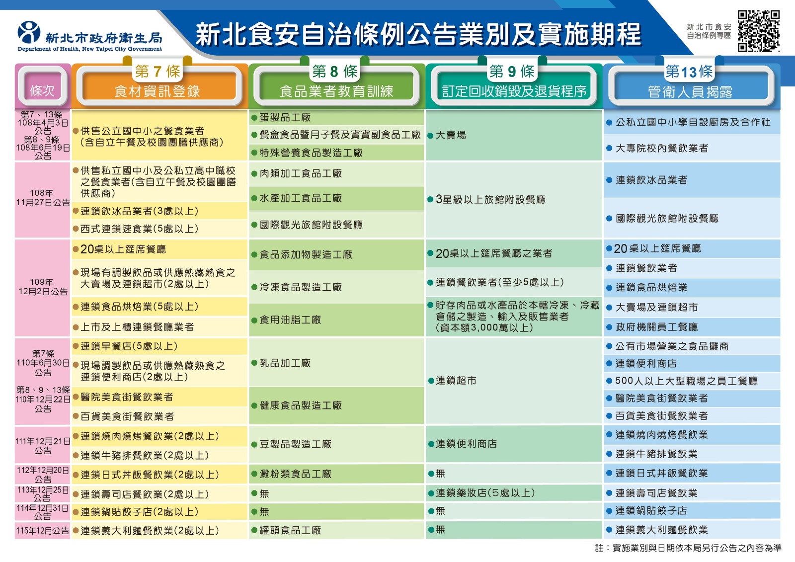 新北食安自治條例另行公告業別及規模一覽表