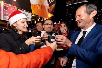 12月5日新北市市長侯友宜、德國經濟辦事處、歐洲經貿辦事處、議會團隊及市府團隊等多位貴賓齊聚進行主燈新秀暨德國耶誕市集開幕儀式,並巡攤品嚐德國道地美食與咖啡