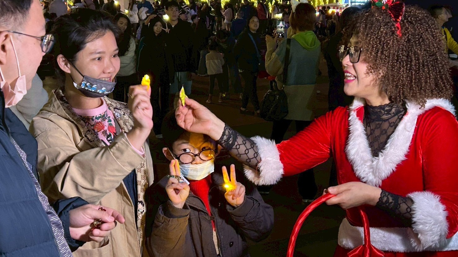晚會現場市府員工特別裝扮成耶誕女郎現身發糖果,在現場散播平安夜喜樂的幸福氣息,跟大家一起分享佳節喜悅