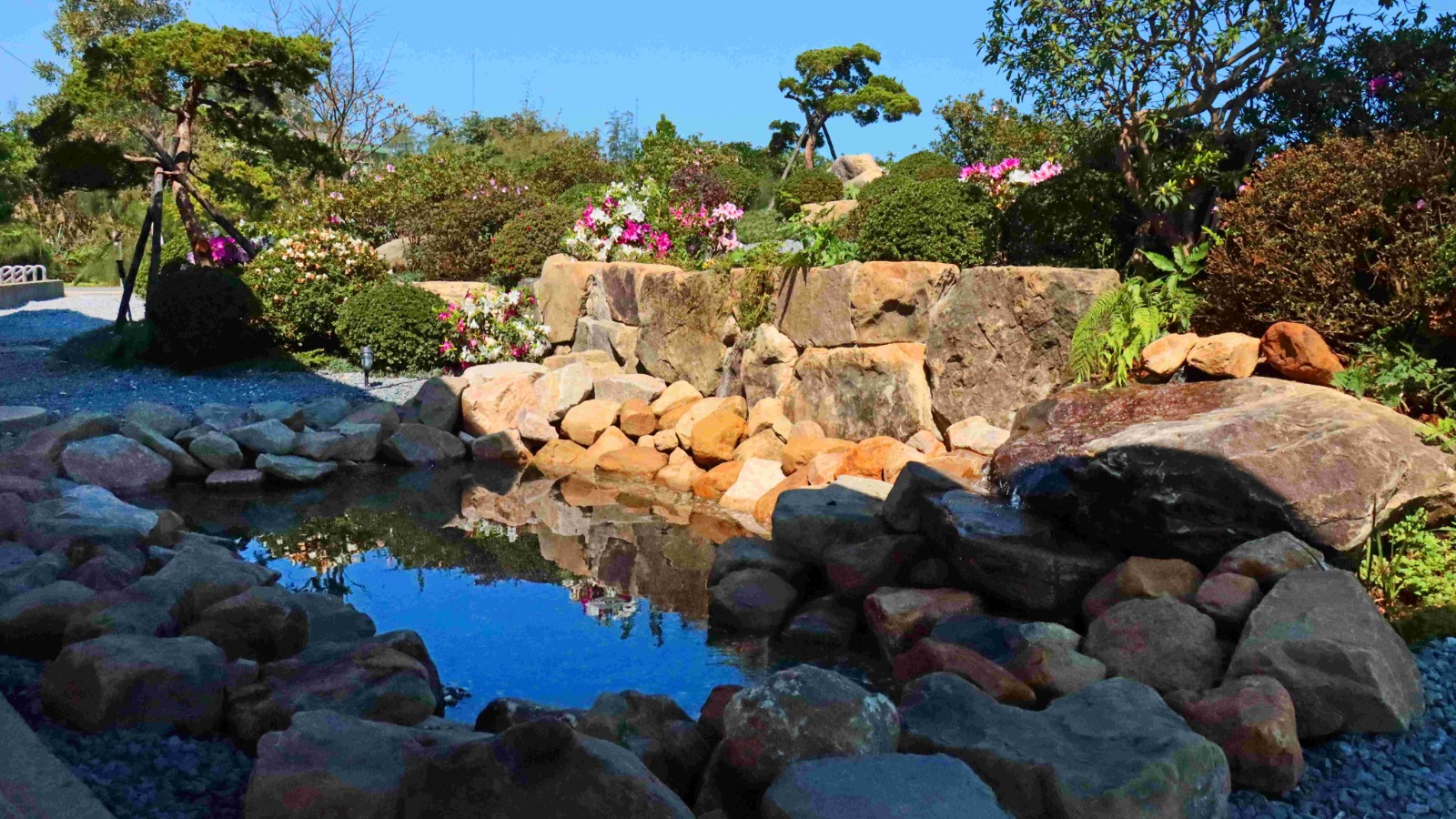 萬里大鵬足湯公園「滿山園」杜鵑庭園造景,以「涼亭為框、足湯為息、杜鵑為韻」的庭園美學,為北海岸增添一處靜心賞景的春日祕境