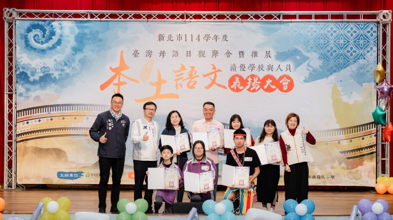 本市於115年1月23日辦理「114學年度臺灣母語日觀摩會暨推展本土語文績優學校與人員表揚大會」。表揚長期用心付出的本土語文老師,另頒發本土語文影音創意說唱讚、母語日活動績優學校、本土語言認證績優學校獎、本土語文績優人員暨團體獎及資深優良族語老師獎等,共96所績優學校、10位績優教師獲獎。新北市訂定推動本土語文教育獎勵計畫,鼓勵各校提升通過中高級認證教師人數,積極達成合格教師授課本土語的目標,並以「趣味學習、生活母語」為核心理念,致力打破課堂與生活的界線,除了開發全國首創的本土語創意桌遊教材外,今年更展現數位研發能量,將母語傳承與科技載具深度結合,讓孩子在潛移默化中自然習得本土語言,展現新北母語教育與時俱進的行動力。本次活動不僅是對第一線教育工作者的肯定,更是「被看見、能傳承」的重要平台,感謝各校長期在本土語教學用心付出,在114年全國語文競賽中,新北更勇奪64座臺灣台語、客語及原住民族語類之特優,讓新北的本土語教育展現亮眼的成果。