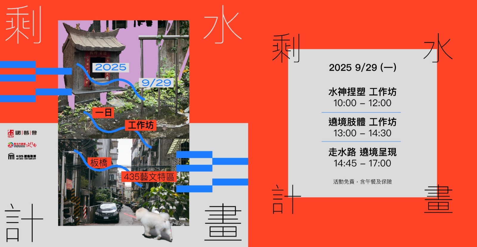 114年9月435藝術聚落進駐藝術家潘怡安及簡詩翰,辦理《剩水計畫》工作坊,連續3堂課程帶領親子探索板橋水文化與地方信仰連結。第1堂課程「水神捏塑工作坊」認識板橋的水文地景與信仰,透過親子合作捏塑,創造獨特的「守護水神像」;第2堂課程「遶境肢體工作坊」認識遶境祭儀的文化意涵,以生活用品為道具,創造聲響與肢體的當代祭儀行動;第3堂課程「走水路遶境呈現」以步行形式追尋板橋隱匿的水路與水神信仰,結合親子共創的「水神像」與「儀式動作」,在街區間以行動重構水文、信仰與地方的連結。