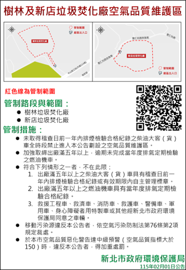 新北市環保局公告劃設「樹林及新店垃圾焚化廠空氣品質維護區」,於115年2月1日起正式上路。