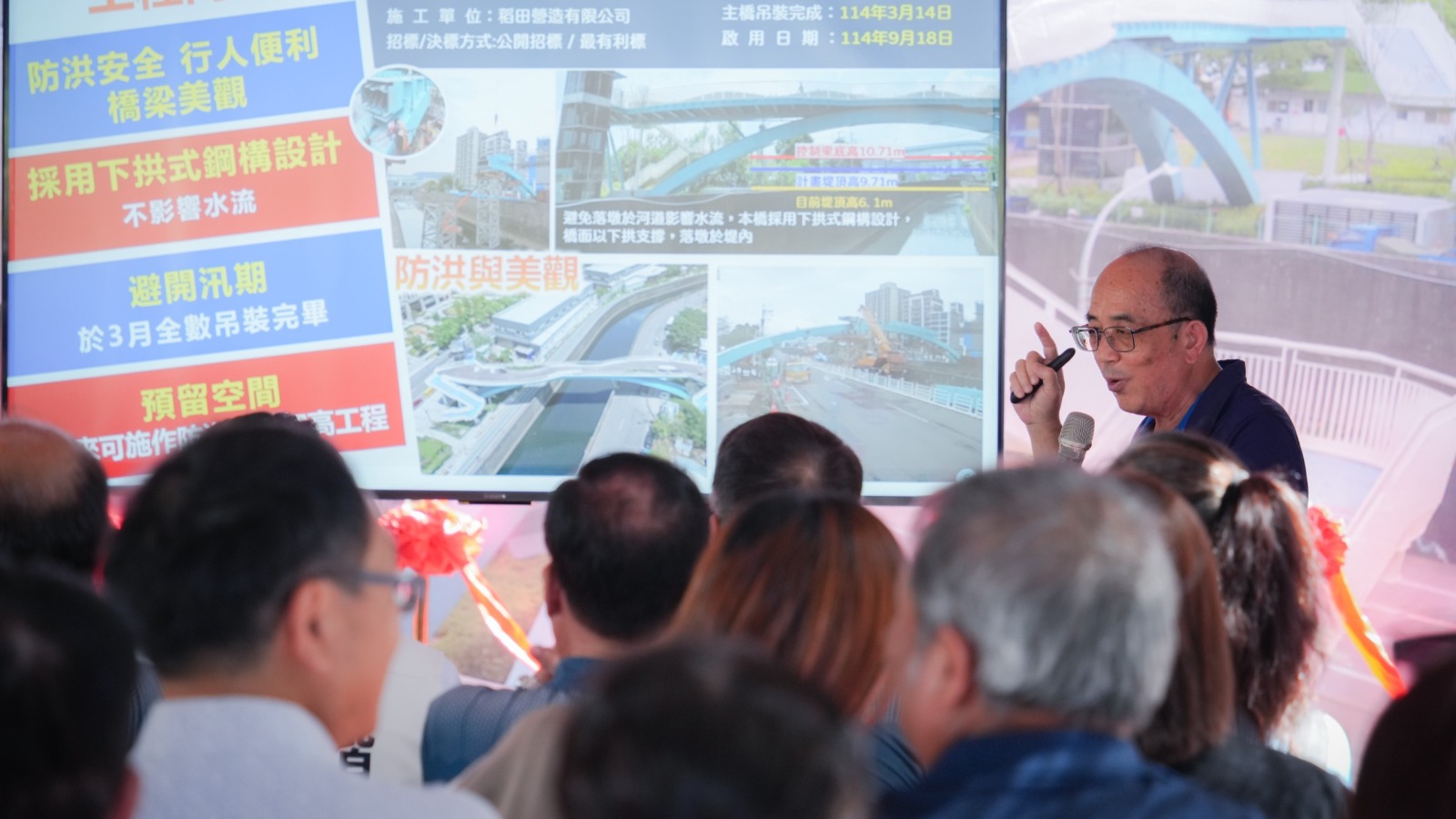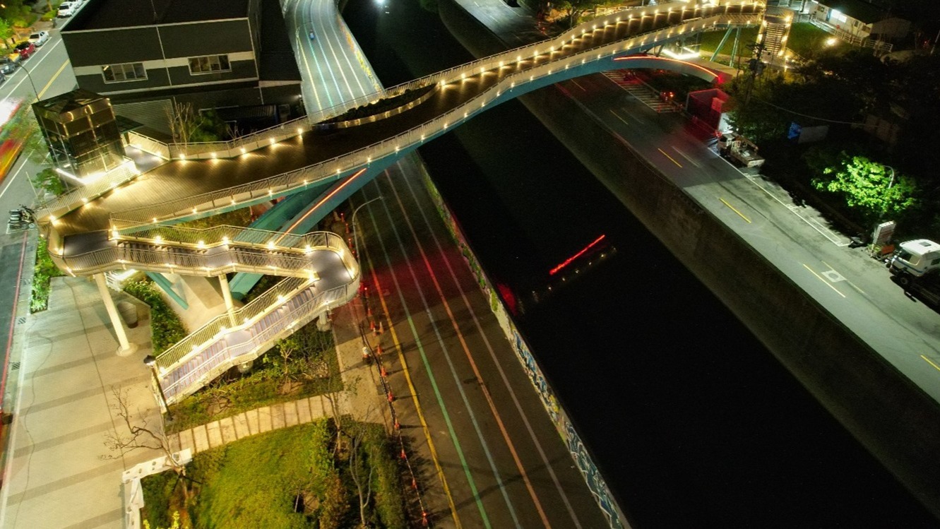 水利局長宋德仁指出,這座橋梁在設計上充分兼顧安全、防洪與生態保護。採取不落墩設計,避免阻礙水流並減少對河川生態的影響,同時將梁底高度抬高至計畫堤頂以上1公尺,確保未來堤防加高施作時仍保有足夠空間。橋體材質則選用高耐用、防腐蝕鋼材,橋面鋪設防滑地材,大幅降低後續維護成本,並提升行走安全。周邊環境同步優化,包含步道改善、綠美化植栽,不僅是一條橋,更是居民休憩、親水的友善空間。