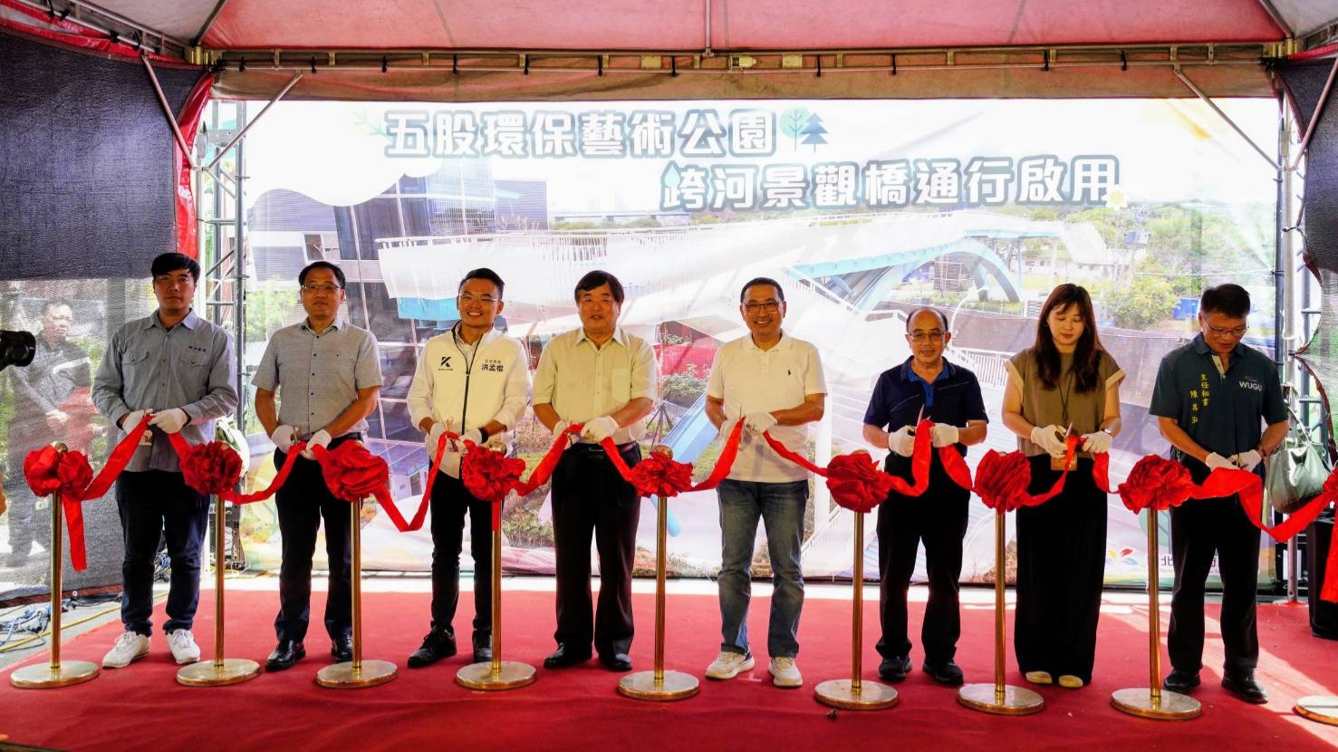 侯友宜表示,景觀橋是市府「翻轉五股」的重要建設之一,總經費投入達1.7億元,自112年12月動工興建,於114年9月18日開放通行。橋梁設計以優雅的下拱式鋼構造型呈現,全長150公尺、橋面寬6公尺,可同時容納行人與自行車通行,另外,也考量各族群民眾需求,貼心設置了無障礙電梯、牽引坡道與休憩座椅,讓行動不便的長輩或推嬰兒車的家長都能輕鬆使用。